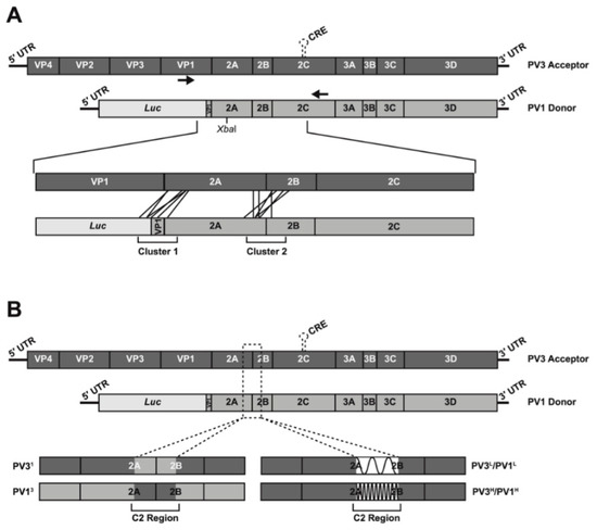 Schematic representation of CRE-REP assays. (A) Intertypic CRE-REP assay showing the genomes of the PV3 acceptor and PV1 donor RNAs. Black arrows represent position of primers used to amplify recombinant genomes. The lower expanded image illustrates the recombination window and highlights examples of recombination events in Cluster 1 and Cluster 2. The position of a unique XbaI site used for screening is shown in the donor template. (B) Modified CRE-REP assays highlighting the region of modification within Cluster 2 and the resulting acceptor and donor templates with altered sequence identity or RNA secondary structure.