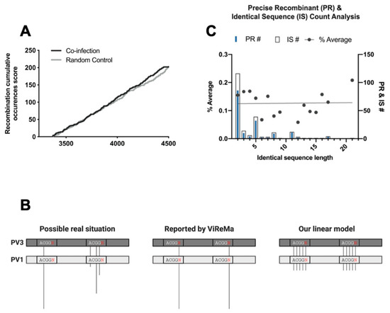 Analysis of recombination junction sequences generated from virus coinfection. (A) The occurrence of recombination on the genome was given a score of 1 while no occurrence was 0. The number of recombination occurrences was calculated in a cumulative way, i.e., the occurrence of recombination at each position was added to the occurrence at the previous position. This was applied to two populations; the precise recombinants from the virus coinfection sample and a random recombination model generated by Excel. The cumulative recombinant count (y-axis) was plotted against the locations on the PV1 (donor) amplicon (x-axis). (B) An identical sequence length (IS) of 4 nt, which hypothetically occurred twice in the genome, was used as an example. The rectangles correspond to a part of the targeted region of PV1 and PV3, the lines represent recombinants and their lengths denote the NGS read, i.e., the longer the line, the more NGS reads. The identical sequence is placed within a smaller rectangle and the red Ns represent a mismatch of any other nucleotides. Looking at a possible real situation in the left panel, the Precise Recombinants (PRs) occurred at different sites within the identical sequence with different reads. ViReMa will always report 1 PR per IS—something similar to the middle panel. In our linear model, we convert ViReMa model into the right panel, where junction counts equal the number of sequence identity length + the mismatch, and NGS reads are equal for all junctions. (C) Individual counts of identical sequences (IS) of different lengths were summed within the amplified region and plotted along with the count of precise junctions that mapped to each different length of sequence identity. For each of the latter the average number of junctions per nucleotide was calculated, assuming that recombination was equally likely to occur at each position within identical donor and template sequences. The linear regression analysis was performed to compare the slopes between the predicted-data model (fitted line) and the expected-data model (perfect line); since the slopes of both lines are nearly identical, only one line can be seen in the figure.
