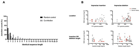 The influence of identical sequence length and reading frame on imprecise recombination. (A) The imprecise recombinants were counted at each identical length (x-axis) and the percentage proportion related to the total imprecise junctions was calculated (y-axis). The flattened data of the imprecise recombinants generated from the coinfection experiments (grey) were plotted against a random control (black), where every possible imprecise junction was created and classified using a custom Perl script. (B) In the upper panel, the locations of the detected imprecise recombinants on the PV1 genome were plotted against the NGS read count. In the lower panel, the size of either the insertions or deletions of the detected recombinants were plotted against NGS read count. Each dot represents a unique recombinant.