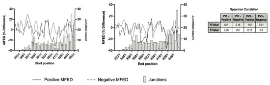 The influence of RNA structure on recombination. The MFED was calculated for a 100 nt sliding window (at 30 nt increments) for both PV1 and PV3 positive and negative strands (dashed and solid lines, respectively) and plotted against the number of total recombinants within the same sliding window. We chose a 100 nt window, as we found from our previous studies [19,20,28] that decreasing the sliding window size would introduce noise to the system attributed to the appearance and disappearance of small stem–loop structures, making the MFED values less conclusive. Spearman’s correlation coefficient was calculated between the recombinant count and the MFED values on either strand.