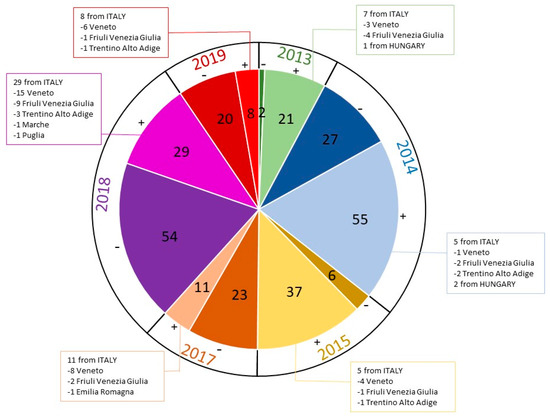 All (n = 293) samples submitted for parvovirus detection to the diagnostic virology laboratory at IZSVe between 2013 and 2015 and between 2017 and 2019 were intestinal. In total, 161 out of 293 (54.95%) intestine samples were positive for CPV-2 infection, of which, 21 were collected during 2013, 55 during 2014, 37 during 2015, 11 during 2017, 29 during 2018 and 8 during 2019 (Figure 1).