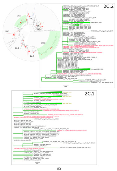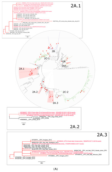 (A) Circular phylogenetic tree of the VP2 nucleotide sequences of CPV-2 identified in the present study (identified with a red dot) and similar CPV-2 strains available in GenBank. Groups 2A.1, 2A.2 and 2A.3 were highlighted in the circular tree and magnified in rectangular boxes. The IZSVe CPV-2 strains are highlighted in red. (B) Circular phylogenetic tree of the VP2 nucleotide sequences of CPV-2 identified in the present study (identified with a red dot) and similar CPV-2 strains available in GenBank. Groups 2B, OR and INT were highlighted in the circular tree and magnified in rectangular boxes. The IZSVe CPV-2 strains are highlighted in red. (C) Circular phylogenetic tree of the VP2 nucleotide sequences of CPV-2 identified in the present study (identified with a red dot) and similar CPV-2 strains available in GenBank. Groups 2C.2 and 2C.1 were highlighted in the circular tree and magnified in rectangular boxes. The IZSVe CPV-2 strains are highlighted in red.