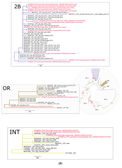 The third group containing IZSVe CPV-new2a strains was 2A.3, characterized by eleven Italian CPV-2 strains detected between 2013 and 2018 (four out of eleven identified in the present study) and interestingly, by foreign sequences exclusively from Hungary all (n = 4) detected in 2012 (Figure 3A and Figure S1). In detail: two IZSVe CPV-2 strains were identified in 2018 from Trentino Alto Adige, clustering with an Italian CPV-2 strain identified from a wolf in Central Italy (Abruzzo-MT454914), one IZSVe CPV-2 from Friuli Venezia Giulia in 2017 and one from Veneto in 2018. The remaining six Italian CPV-2 sequences of this group were identified, with four from Veneto from 2014 and 2018 and two from Sardinia identified in 2013 (Figure 3A and Figure S1). The two IZSVe CPV-2 strains from Trentino Alto Adige identified in 2018 shared an nt mutation in the VP2 gene: the A156G (Table 2). This small subgroup contains a sequence from a wolf (Abruzzo-MT454914) for which it was not possible to assess the presence of the A156G mutation due to lack of sequencing coverage. The twelve CPV-new2b strains identified in the present study were all grouped in the group 2B, with other exclusively Italian CPV-2 strains (Figure 3B and Figure S1). In detail, this cluster contained CPV-new2b Italian strains from Northeast Italy (n = 11, 10 out of 11 identified in the present study) detected between 2015 and 2018, a strain from North West Italy (n = 1) detected in 2012, strains from Central Italy (n = 10, 1 out of 10 identified in the present study) detected between 2008 and 2018, and strains from South/insular Italy (n = 4, 1 out of 4 identified in the present study) detected between 2011 and 2018 (Figure 3B and Figure S1). The remaining ten strains of this group were detected between 2009 and 2017, for which the region of origin is not available (Figure 3B and Figure S1). However, the oldest dog CPV-new2b strain of this group was detected in Central Italy in 2008 (MH491853 5733_Italy_Lazio_14_06_2008) and likely spread to North and South Italy. Interestingly, the 2B group is characterized by a small sub-group composed of three IZSVe CPV-2 sequences (MT996025, MT996020 and MT996036) that all present the mutation T459C (Table 2). The 2C groups were formed by CPV-2c strains displaying broader heterogeneity, as various geographic origin strains fall into 2C.1 and 2C.2 groups and are specifically from Europe, Asia and Africa (Figure 3C and Figure S1). The IZSVe CPV-2c strains appear scattered within the two 2C groups. Eight IZSVe CPV-2c strains fall into the 2C.1 group and five into the 2C.2 group (Figure 3C and Figure S1). The IZSVe 2C.1 strains were detected from 2015 to 2019, and the IZSVe 2C.2 strains were detected from 2013 to 2019 (Figure 3C and Figure S1). The phylogenetic analysis showed a distinct clustering of the vaccine CPV-2 strains divided into two main groups: CPV-2 OR and CPV-2 INT (Figure 3B and Figure S1), where two IZSVe CPV-2 OR and four IZSVe CPV-2 INT strains, respectively, fall into these groups (Figure 3B and Figure S1).