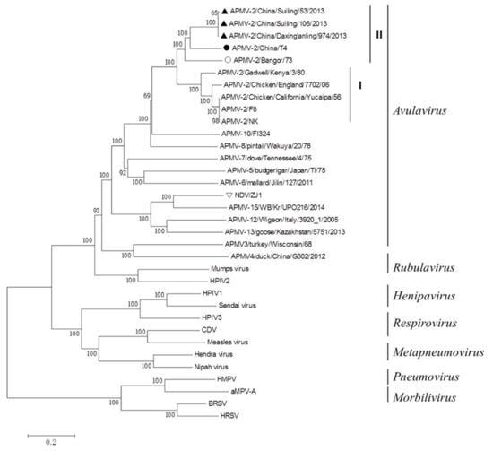 The genome sequence of APMV-2-T4 consists of 15,000 bp. A phylogenetic tree was generated based on the complete genomes of family Paramyxoviridae. APMV-2-T4 remained in the same cluster with three strains of APMV-2 isolated from China, and the sequences homology is 77.4–77.6%. APMV-2/Suiling/106/2013 has the highest homology with APMV-2-T4 (77.6%). The foreign representative strain with the highest homology with APMV-2-T4 strain is APMV-2/Bangor/73, with a homology of 77.2% (Figure 1). These five viruses were placed in genetic group II.