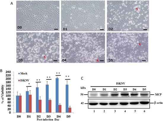 The examination of ISKNV infection in the cell survival assay showed that it induced host cell damage. In the viability assay, we found that ISKNV can induce cell death from D2 (Figure 1A). Then, we counted the survival rate, as shown in Figure 1B. The results of the ISKNV study showed that it induces host cell death from D2 (26%) to D5 (72%) (Figure 1A,B) compared to D0 (100%) and the mock control (131% (D2) to 167% (D5)). On the other hand, the viral protein MCP was checked and monitored from D0 to D5. In the MCP, the protein was gradually expressed from D1 to D5, with major expression at D3, which correlated to cell death induction.