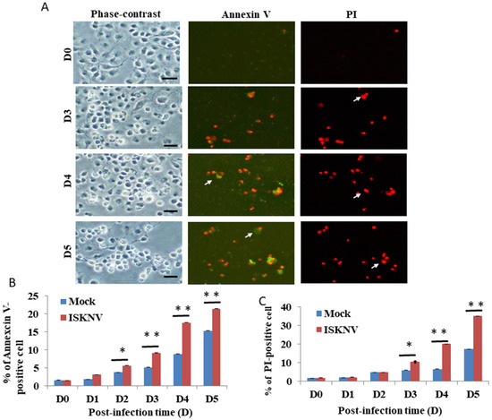 ISKNV directly induces apoptotic/necrosis cell death by dual labeling with Annexin-V/PI staining in GF-1 cells. (A) Phase-contrast micrographs of ISKNV-induced apoptotic/necrosis GF-1 cells at different time points (D0, D3, D4, and D5). Phase-contrast (left panels D0, D3 D4, and D5); green fluorescence images for Annexin-V-positive cells (middle panels D0, D3 D4, and D5); and red fluorescence images for necrosis-positive cells (right panels D0, D3 D4, and D5), in which Annexin-V-positive cells and necrosis-positive cells are indicated by arrows. Scale bar = 20 µM. (B,C) The percentage of apoptotic/necrosis ISKNV-induced cells at different time points. The numbers of ISKNV-infected cells containing apoptotic/necrosis cells in each 200 cell sample were assessed in three individual experiments. Each point represents the mean ISKNV-induced apoptotic/necrosis cells of three independent experiments ± the standard error of the mean (SEM). The data were analyzed using either paired or unpaired Student’s t-tests, as appropriate. Statistical significance was defined as * p-values < 0.05; ** p-values < 0.01.
