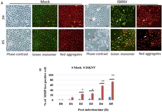 To determine whether ISKNV can induce the loss of MMP, mitochondrial function was evaluated using MitoCapture Reagent (JC-1 dye). This dye is trapped in the mitochondria with normal ΔΨm and released from the mitochondria with abnormal ΔΨm into the cytosol, resulting in the loss of fluorescence intensity. In healthy cells, the MitoCapture dye (JC-1) aggregates in the mitochondria and fluoresces red. In apoptotic or secondarily necrotic cells, the dye cannot accumulate in the mitochondria and is distributed throughout the cytoplasm as a fluorescent green monomer. The loss of MMP (Figure 3A; indicated by arrows) was induced by changes in the green or red fluorescence intensity with ISKNV infection at different time points from D2 to D5, which showed losses between 22% and 61%, respectively, compared with the mock groups (Figure 3B).