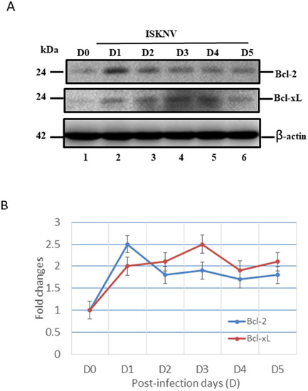 ISKNV infection can upregulate Bcl-2 and Bcl-xL gene in GF-1 fish cells. (A) Identification of anti-apoptotic members Bcl-2 and Bcl-xL proteins by Western blot analysis. Infection of GF-1 cells with ISKNV at D0, D1, D2, D3, D4, and D5 pt in GF-1 cells, where lanes 1-6 display ISKNV-infected GF-1 cells. Blots were probed with an anti-mouse Bcl-2 and Bcl-xL monoclonal antibody (1:7000), and an anti-mouse β-actin monoclonal antibody (1:12,500). (B) Quantification of protein expression level by Image J software, from (A) that D0 as a one fold control was counted for compared with other ISKNV-infected groups from D1 to D5, respectively.
