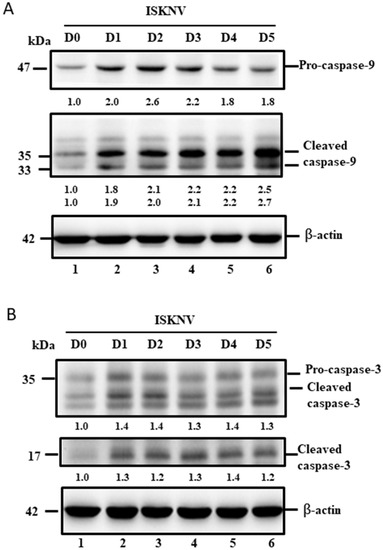 3.5. ISKNV Induces Caspase-9 and Caspase-3 Activation at the Replication Stage
