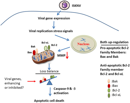 Although some efforts have been made to understand the pathogenesis of ISKNV infection, the interactions between the virus and host are still little understood. ISKNV has a larger genome with a length of 111,362 bp that includes up to 124 potential open reading frames (ORFs), indicating that the relationship between the virus gene and the host response is relatively complicated during viral replication [20,54]. Recently, Grouper iridovirus GIV (Ranavirus strain) has been shown to belong to the Iridoviridae family and harbors GIV66, a putative Bcl-2-like protein, which the potent anti-apoptotic activity of GIV66 by identifying it as a new pro-survival Bcl-2 protein and identifying a pivotal role of pro-apopotic Bim in GIV-mediated inhibition of apoptosis [55]. On the other hand, In GSIV stain, serine/threonine (ST) kinase can induce Bax/mitochondria-mediated cell death pathway, which can be blocked by the interaction of Bcl-xL and Bcl-2 with Bax to inhibit cytochrome c release during MMP loss. Furthermore, this rescue activity also correlated with inhibition of caspase-9 and -3 activation, thereby enhancing cell viability and will be considered to apply in viral regulation [56].