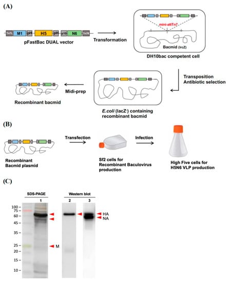 In our previous study, we established a lentiviral pseudovirus system, which is able to rapidly screen out the broad-spectrum virus strain during outbreaks and examine vaccine immunogenicity. Through the neutralization assay of the generated avian influenza H5 subtypes pseudoviruses antisera, we found that H5N6-Sichuan subtype antisera exhibited better cross-protectivity among H5N2, H5N6 and H5N8 subtypes [16]. In order to further investigate whether H5N6-Sichuan strain could be a potential vaccine candidate, we first generated the virus-like particles derived from H5N6-Sichuan strain by using a Bac-to-Bac baculovirus expression system. The full-length HA and NA derived from H5N6-Sichuan were PCR amplified and cloned into pFASTBac vector. The plasmid was then transformed into DH 10BacTM competent cells, which contain a bacmid DNA. Using mini-attTn7 site-specific transposition, the inserted foreign genes will disrupt the LacZα gene, and the recombinant bacmid containing the desired insert can be identified by blue-white selection (Figure 1A).