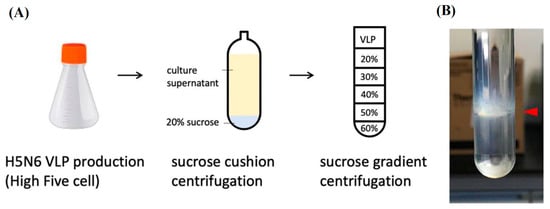 Purification of H5N6 VLPs by sucrose gradient. (A) Purification steps for H5N6 VLPs purification. The H5N6 VLPs were precipitated by a 20% sucrose cushion first and further purified by a 20–60% sucrose density gradient. (B) A visible band at 45% of sucrose fraction indicated the purified H5N6 VLPs.