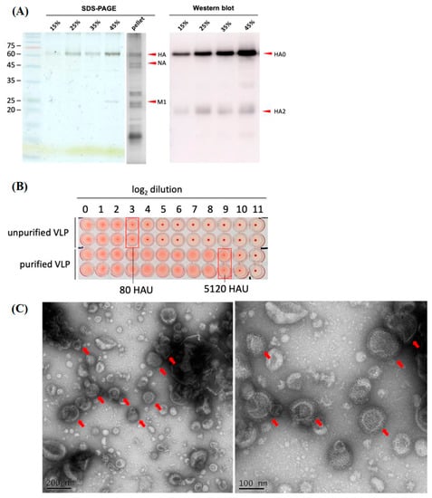 In order to verify whether the major immune epitope, HA proteins, still remained in the H5N6 VLPs after purification, we detected the proteins by Western blot using avian flu anti-HA antibody. SDS-PAGE with silver stain was also performed to examine the purity of H5N6 VLPs. The results showed that the fraction of 45% sucrose not only had the majority of the HA but also the NA and M1 proteins; furthermore, other proteins derived from the High Five cells were mostly removed after purification (Figure 3A).