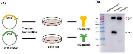 293T cells were seeded in 15 cm dishes (0.75–0.9 × 106 /mL, 20 mL/dish). After 16 h of incubation, plasmids with pTT5 vector (pTT5-SCH5, pTT5-SCN6, Leadgene Biomedical, Inc., Tainan, Taiwan) were transfected with 15 μg of H5 or N6 plasmid DNA per dish, respectively, by Hyfect transfection reagent (Leadgene). Dishes were refreshed with cell medium (FreeStyle 293 expression medium) 24 h later. At 72 h post-transfection, supernatant was collected and centrifuged at 500× g to remove the cell debris. The supernatant was further precipitated via ammonium sulfate. The desired HA and NA proteins were visualized by Western blot with anti-His tag mAb (1:5000, Leadgene). The blots were then incubated with secondary antibody (1:5000, goat anti-mouse IgG, HRP-labeled, KPL) and developed using enhanced chemiluminescence (ECL, Bio-Rad, Hercules, CA, USA) substrate. All the images were captured by Amersham Imager 600.
