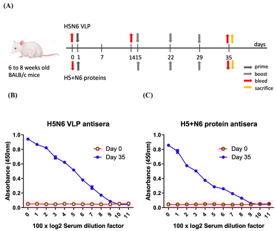 Groups of BALB/c mice were immunized by intraperitoneal route (i.p) with purified H5N6 VLPs or 293T cell expressed H5+N6 proteins. Serum samples were collected at pre-immunization and day 35 post-immunization (Figure 5A). The level of total IgG was measured by ELISA. The results showed that pre-immunized antisera had no specific IgG antibody against H5N6 VLPs and 293T cell-expressed H5+N6 proteins (Figure 5B,C). At day 35 post-immunization, IgG antibody end-point titers against their immunized antigens were both 100 × 210 in H5N6 VLPs and 293T cell-expressed H5+N6 proteins antisera, suggesting that mice immunized with H5N6 VLPs and 293T cell-expressed H5+N6 proteins successfully generated the IgG antibodies against the antigens (Figure 5B,C).