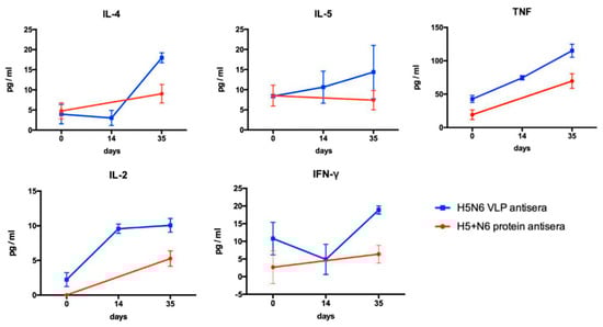 Cytokine profiles of mice immunized with H5N6 VLPs or 293T cell-expressed H5+N6 proteins. Antisera of vaccinated mice were collected at different timepoints: pre-immunization, day 14 and day 35 post-immunization The cytokines (IL-2, IL-4, IL-5, IFN-γ, and TNF) in antisera were measured by cytometric bead array (CBA) multiplex assay. Serum samples collected at each time-point were measured in duplicates.