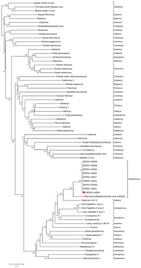 4.3. DERSV Had a Typical Picornavirus-Like Genomic Structure