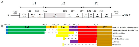 - Wang, X.; Liu, N.; Wang, F.; Ning, K.; Li, Y.; Zhang, D. Genetic characterization of a novel duck-origin picornavirus with six 2A proteins. J. Gen. Virol. 2014, 95, 1289–1296. [Google Scholar] [CrossRef]
