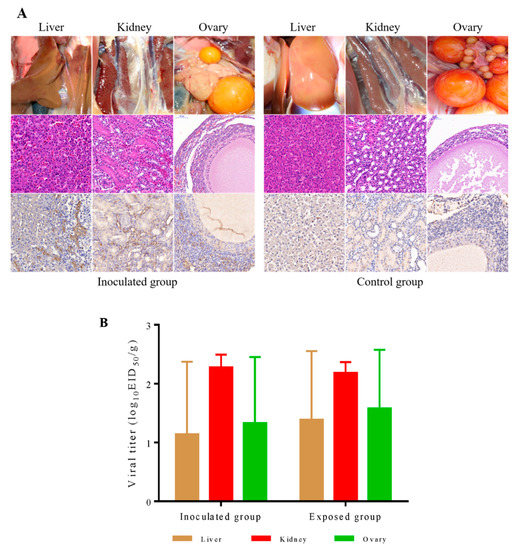 Pathogenicity of DERSV ducks. (A) Infected ducks show liver and renal hemorrhage, follicular hemorrhage, and rupture. Congestion of hepatic venules and sinusoid, congestion of renal interstitium, degeneration of renal tubular epithelial cells, and Necrosis of follicular epithelial cells were detectable on the tissue sections accordingly. In addition, viral antigens could be observed in those tissues of infected ducks. (B) Virus titer in tissues of livers, kidneys, and ovaries of inoculated and exposed ducks was determined on 9-day-old embryonated duck eggs. The lower limit of virus detection was 0.5log10 EID50 per gram tissue.