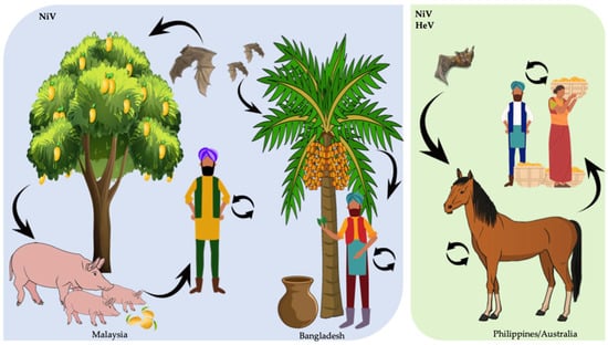 (ii) Contact with domestic animals: The fact that domestic animals are susceptible to zoonotic viruses thus having the potential for disease transmission to humans is crucial in creating spill-over risks for highly pathogenic viruses. Transmission of NiV to domestic animals takes place when these feed from palm sap or partially eaten fruit contaminated with NiV-containing feces, urine, or saliva. If infected, these domestic animals can then shed the virus and transmit it to humans. The combination of fruit trees, pigs, bats, and humans in the same surroundings facilitates the emergence of henipaviruses. With this model, transmission of henipaviruses to humans requires close proximity. Several further NiV outbreaks in 2001, 2003, and 2004 have been associated with contact with domestic animals [58,80]. In Malaysia and Singapore, transmission has mainly occurred through contact of humans with pigs. However, in the case of NiV outbreaks in Bangladesh (and India), transmission is mainly food-borne originated, mostly due to the consumption of contaminated palm sap [83,87] or due to human-to-human transmission (see Section 3) [88]. In the case of HeV, it appears that only horses become directly infected by bats and thus act as amplifying hosts. It has previously been shown that HeV can be excreted from infected horses up to 72 h before the animals present clinical signs [89]. However, HeV infectivity is low and humans are generally infected only when highly exposed to HeV-infected horse secretions or organs. Despite the fact that bat handlers are frequently exposed to potential pathogens from sick bats by scratches, bites, saliva, feces, etc., no direct transmission of HeV from bats to humans has been reported.