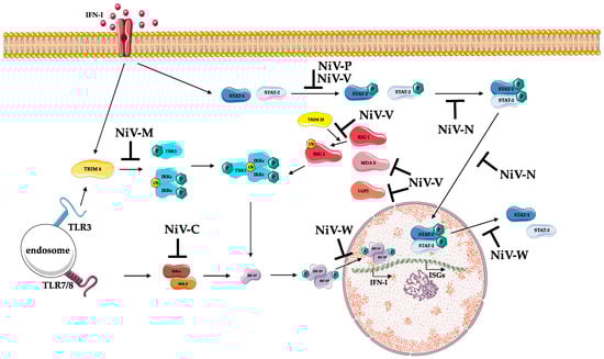 Schematic representation of NiV innate immune modulation in humans. NiV uses several immune modulation mechanisms to alter type I interferon (IFN-I) production and signaling. TLR and RLR detection of NiV RNA leads to IFN-I and IFN-stimulated gene (ISG) activation; however, several NiV proteins interfere in this process at different levels: NiV-V can prevent RIG-I, MDA5, and LGP2 stimulation. Conjointly with NiV P, NiV-V can also prevent STAT phosphorylation. NiV-N can inhibit STAT dimerization and also its nuclear importation. In addition, NiV-W prevents STAT1 and STAT2 nuclear exportation. NiV-M induces the degradation of TRIM6, thus preventing IKKε ubiquitination (Ub), oligomerization, and phosphorylation (P). NiV-C inhibits IKKα/β dimerization, necessary to activate IRF3 and IRF7, and in the same pathway, NiV-W protein inhibits nuclear transport of phosphorylated IRF3/7 dimers. Altogether, these mechanisms prevent the expression of IFN-I and ISG genes.