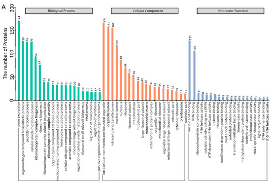 To identify cellular pathways in the PCV3 or PCV4 Cap-host protein interaction network, we conducted gene ontology annotation of the proteins common to PCV3 or PCV4 Cap-transfected PK-15 cells (Supplementary Table S2) to forecast their molecular functions. GO annotation was performed for the following three categories: biological processes, molecular functions, and cellular components. Many biological processes, such as gene expression, organonitrogen compound biosynthesis, peptide metabolism, cellular amide metabolism, and ribonucleoprotein complex biogenesis, were enriched. In addition, nucleic acid binding, RNA binding, ribonucleoprotein complex binding, and ATP-dependent RNA helicase activity were enriched within the category of molecular function, while intracellular non-membrane-bounded organelles, intracellular organelle lumen, and nuclear lumen were enriched under the category of cellular components (Figure 3A,B and Supplementary Table S4). In summary, GO annotation of common proteins suggested that PCV3 or PCV4 Cap might disturb some processes such as ribosome biogenesis, nucleic acid binding, and ATP-dependent RNA helicase activity.