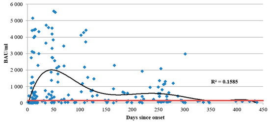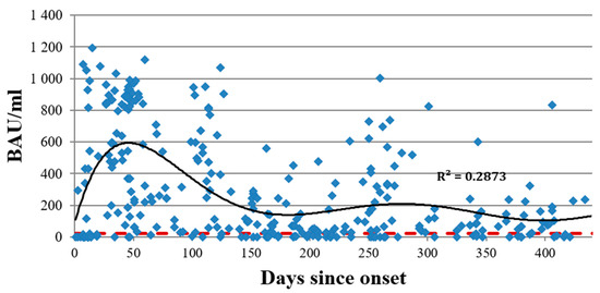 Total anti-S protein (RBD) antibody dynamics (ELISA) as a function of time since COVID-19 onset for 312 individual patients. The range was from 1 to 438 days. IgG concentration is presented in BAU/mL. The red dotted line represents the cut-off value for this specific ELISA kit (22.6 BAU/mL). The black line is the trend, with an R2 of 0.28.