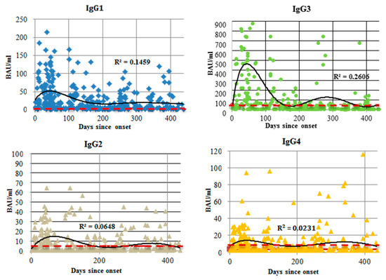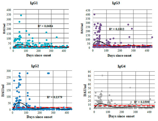 Total anti-S protein (RBD) IgG antibody dynamics (ELISA) by subclass, as a function of time since COVID-19 onset for 312 individual patients. The range was from 1 to 438 days. Concentration is presented in BAU/mL. The red line represents the cut-off value for this specific ELISA kit. The black line is the trend. R2 values are shown on the graph.