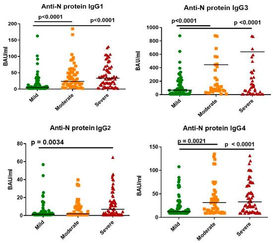 When comparing anti-N protein Ab concentrations by IgG subclass, we noted two points. Firstly, there was a correlation between illness severity and IgG subclass concentration. The Spearman’s rank correlation (rs) for IgG1, IgG2, IgG3, and IgG4 were 0.42, 0.21, 0.37, and 0.36, respectively (p < 0.0001). We considered this correlation to be weak. Similar findings (correlation between Ab concentration and illness severity) have been presented in multiple studies [21,22,23,24,25], although in those studies the main focus was on total anti-N protein IgG levels.
