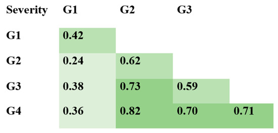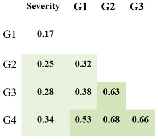 Correlation matrix for anti-S protein IgG subclasses and illness severity, analyzed with Spearman correlation coefficient. Darker shades of green represent more solid correlation: 0.2–0.39—weak correlation; 0.4–0.69—fair correlation; 0.7–1.0—solid correlation. p-value for all presented coefficients < 0.001.