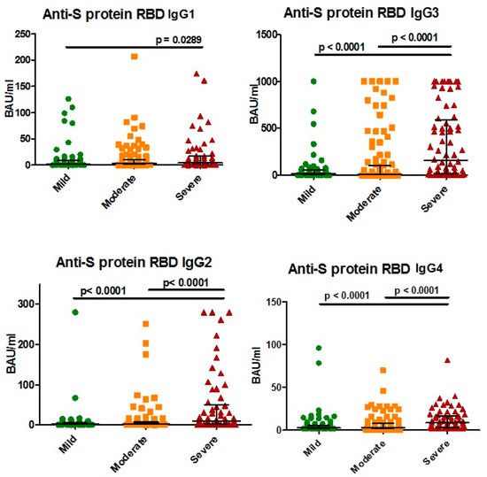 In samples from patients with severe infections, Ab concentrations were significantly higher than in those from patients with milder courses of illness. These data correspond with information provided by multiple sources [8,29,30,31,32]. Among all Ab subclasses analyzed (anti-S protein RBD), IgG4 had significantly lower concentrations compared to the other subclasses (p < 0.0001).