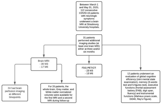 During the COVID-19 outbreak between 1 March and 31 May 2020, 112 consecutive COVID-19 patients with neurologic symptoms underwent a brain MRI at Strasbourg University hospitals. Out of these 112 patients, 31 patients underwent additional imaging studies (requested by the physicians in charge of the patient, at least one brain MRI) either at three and/or six months and were finally recruited. These neuroimaging examinations were either carried out systematically or because of a persistent complaint.