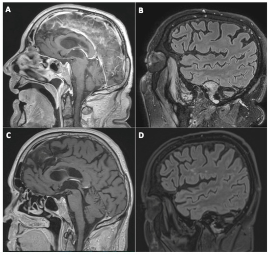 A 79-year-old man (#21) initially hospitalized (ICU) (A,B), who underwent a second MRI during follow-up 112 days later (C,D). Sagittal post-contrast three-dimensional T1-weighted spin-echo MR imaging (A,C) and sagittal FLAIR MR images (B,D). Basilar artery wall enhancement (A) with normalization of the vessel wall imaging during follow-up (C), and appearance of white matter FLAIR hyperintensities, presumed of a vascular origin (D).