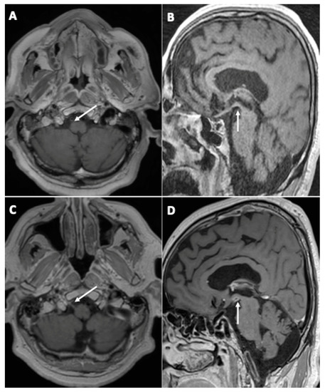A 67-year-old man (#20) (A,C) and a 61-year-old man (#7) (B,D), both initially hospitalized (ICU), who each underwent a second MRI during follow-up 112 (A,C) and 99 (B,D) days later, respectively. Axial (A,C) and sagittal (B,D) post-contrast three-dimensional T1 weighted spin-echo MR imaging. Appearance of contrast enhancement affecting the right hypoglossal nerve (C) (neuritis), and the wall of the posterior cerebral arteries suggestive of cerebral vasculitis.