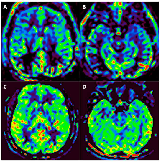 A 46-year-old man (#6) initially hospitalized in the ICU (A,B), who underwent a second MRI during follow-up 92 days later (C,D). Axial arterial spin labeling (ASL) brain perfusion imaging (A–D). Abnormal brain perfusion on initial imaging with frontotemporal hypoperfusion (A,B) and normalization during follow-up (C,D).