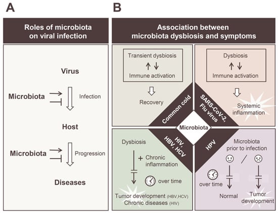 Microorganisms that live symbiotically in humans form various colonies, mainly in the skin, oral cavity, upper respiratory tract, intestinal tract, and reproductive organs []. Regarding the relationship between viral infection and symbiotic microorganisms, viral infection, replication, and pathogenesis are influenced by symbiotic microorganisms living in the vicinity of target tissues. HPV, which infects the oral cavity and genital tract, and noroviruses and rotaviruses, which infect the intestinal epithelium, are representative examples of this relationship. However, changes in the distal intestinal microbiota are observed in respiratory viruses and hepatitis viruses that infect the liver. Thus, it has been suggested that the microbiota acts systemically rather than locally in viral infections, and “gut–multiple organ” axis theories have been proposed []. In other words, the symbiotic microbiota can be regarded as an important factor governing the clinical outcomes during viral infection.