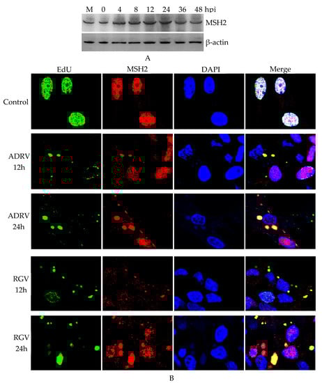 3.1. MSH2 Was Expressed during ADRV Infection and Localized with Viral Nascent DNA