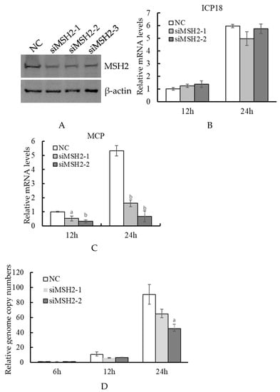 Determination of the effect of MSH2 knockdown on ADRV infection. siRNAs targeting MSH2 were transfected into BHK-21 cells. The transfected cells were subjected to Western blotting analysis (A) or infected with ADRV. Expression of ADRV immediate early gene ICP18 (B) and late gene MCP (C) were determined by RT-qPCR. The virus genome copy numbers were determined by quantitative real-time PCR with the standard curve. The virus genome copy number in NC transfected cells at 6 hpi was set as 1 in the figure (D). Significant differences (versus NC at the time point) are marked with a (0.01 < p < 0.05) or b (p < 0.01).