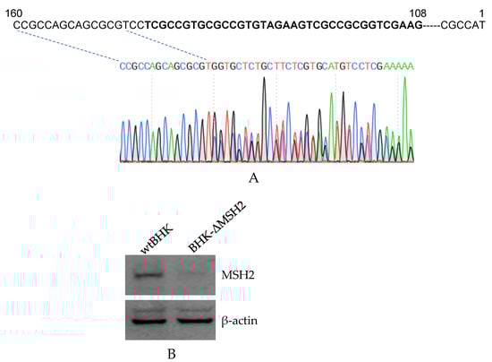 Establishment of MSH2 knockout BHK cells by CRISPR/Cas9. (A). DNA sequencing confirmation of the mutated regions in the MSH2 gene. The sequences with bold font are the targeted sequences by the two gRNAs. The PCR products were sequenced from the reverse direction and the sequence chromatogram showed the sequence from position 160 bp of the gene. (B). Western blot analysis of MSH2 expression in wild-type BHK-21 (wtBHK) and mutated BHK (BHK-ΔMSH2) cells. Detection of β-actin was used as an internal control.