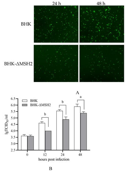 ADRV infection in the BHK-ΔMSH2 cells was examined by infecting the cells with a recombinant ADRV expression EGFP. The results showed that EGFP expression was reduced in BHK-ΔMSH2 cells compared to wild-type BHK cells at the examined time points (24 and 48 hpi) (Figure 5A). The virus titers at different times (0, 12, 24, 48 hpi) were further determined by the TCID50 assay. The virus titers between wild-type BHK and BHK-ΔMSH2 at 0 hpi were nearly equivalent, but the virus titers from BHK-ΔMSH2 were significantly less than that from wild-type BHK at 12 (p = 0.000413), 24 (p = 0.005739), and 48 (p = 0.015251) hpi (Figure 5B), which indicated that MSH2 knockout inhibited ADRV infection.