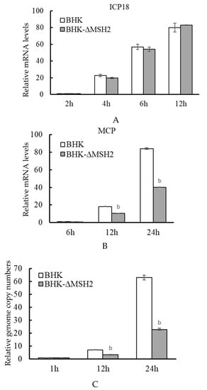 The virus gene expression and genome replication were further examined in the BHK-ΔMSH2 cells. Similar to that observed in RNAi assays, the expression of ADRV immediate early gene ICP18 was not affected in BHK-ΔMSH2 cells compared to wild-type BHK cells at the tested time points (2, 4, 6, and 12 hpi) (Figure 6A), and the expression of the late gene MCP was significantly reduced at 12 (p = 0.008371) and 24 hpi (p = 0.000757) in the BHK-ΔMSH2 cells (Figure 6B).