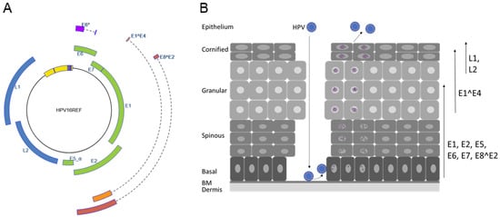 The HPV genome and life cycle. (A) The human papillomavirus 16 genome structure. Open reading frames E1, E2, E5, E6, E7, L1, and L2 are indicated. Spliced mRNAs (indicated by dashed lines) are used to generate the E6*, E1^E4, and E8^E2 proteins. The upstream regulatory region, which is located between the L1 and E6 genes harboring the origin of replication and transcription control elements, is depicted in yellow, and blue bars indicate conserved E1 and E2 binding sites. The illustration was taken from https://pave.niaid.nih.gov/#explore/reference_genomes/human_genomes (accessed on 1 January 2020) []. (B) Schematic representation of the stratified epithelium and the HPV life cycle. HPV virions infect basal cells adjacent to the basal membrane (BM) via microlesions in the epithelial barrier. The viral life cycle is tied to differentiation and ends with the production of progeny virus that are released from terminally differentiated cells. Arrows on the right indicate differentiation-dependent expression of viral proteins. After introduction of viral genomes into undifferentiated keratinocytes, the viral E5, E6, and E7 oncoproteins as well as the replication modulatory E1, E2, and E8^E2 proteins are expressed. Expression of E1^E4 coincides with viral genome amplification in the spinous and granular layers. The expression of L1 and L2 in the terminally differentiated cells of the upper epithelium leads to the packaging of viral genomes, virion synthesis, and the release of virions.