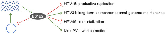 While increased replication and gene expression in short-term assays is a highly conserved phenotype for PV E8^E2 ko genomes, long-term cultivation revealed unexpected differences (Figure 2). HPV16 E8^E2 ko genomes are stably maintained with elevated copy numbers as extrachromosomal elements, revealing that the short-term phenotype can be long-term maintained [,]. In contrast, HPV31 E8^E2 ko genomes cannot be stably maintained as episomes [,]. The beta-HPV49 wt genome is not maintained in human keratinocytes despite encoding and transcribing E6 and E7 oncoproteins with immortalizing activity, whereas an HPV49 E8^E2 ko resulted in immortalized keratinocytes maintaining high copy number extrachromosomal plasmids [,]. This indicates that E8^E2 controls immortalization by inhibiting E6 and E7 transcript levels and limiting genome replication []. E8^E2 restricts viral replication in undifferentiated cells in culture, which are thought to mimic infected keratinocytes in the basal layer of epithelia. Thus, E8^E2 could be involved in the switch from the non-productive to the productive PV replication cycle in differentiating keratinocytes. Surprisingly, HPV16 E8^E2 ko genomes also displayed higher levels of viral genomes, transcripts, and the late viral proteins in differentiated cells than the wt []. This indicated that HPV16 E8^E2 also limits productive replication in differentiated cells (Figure 2), This could be an immuno-evasive strategy of HPV16 in order to limit the amounts of immunogenic viral proteins such as L1.