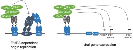 - Dreer, M.; Fertey, J.; van de Poel, S.; Straub, E.; Madlung, J.; Macek, B.; Iftner, T.; Stubenrauch, F. Interaction of NCOR/SMRT Repressor Complexes with Papillomavirus E8^E2C Proteins Inhibits Viral Replication. PLoS Pathog. 2016, 12, e1005556. [Google Scholar] [CrossRef]