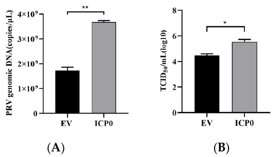 Exogenous expression of ICP0 enhances PRV replication in vitro. PK15 cells were transfected with 1 μg pCMV-Myc plasmid (empty vector, EV) or pCMV-Myc-ICP0 plasmid (ICP0) for 24 h. Then, cells were infected with 0.01 MOI PRV for 24 h before PRV viral copy numbers and titers were measured. Real-time quantitative PCR was used to determine viral copy number (A), and TCID50 assay was performed for viral titer detection (Reed–Muench method) (B). Data are listed as mean ± SD from three independent experiments. Comparison between two groups was evaluated by unpaired Student’s t-test. * p < 0.05, ** p < 0.01.