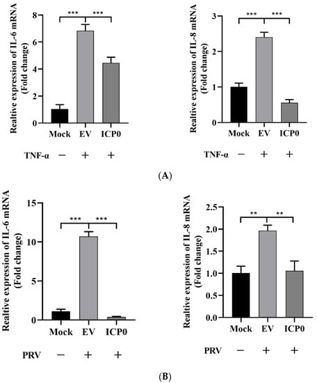 Viral protein ICP0 inhibits IL-6 and IL-8 mRNA transcription. (A) PK15 cells were transfected with pCMV-Myc empty vector (EV) (1.0 µg) or pCMV-Myc-ICP0 (1.0 µg) plasmids for 24 h. Then, cells were treated with or without 50 ng/mL recombinant human TNF-α and incubated for an additional 12 h, followed by total RNA extraction. IL-6 and IL-8 mRNA expression levels were measured by RT-qPCR. (B) PK15 cells were transfected with pCMV-Myc empty vector (EV) (1.0 µg) or pCMV-Myc-ICP0 (1.0 µg) plasmids for 24 h. Then, cells were infected with 0.01 MOI PRV for another 24 h. Cells were collected for cellular RNA extraction, and RT-qPCR was performed for IL-6 and IL-8 mRNA detection. Data are shown as mean ± SD from three independent experiments. Comparison between two groups was evaluated by unpaired Student′s t-test. ** p < 0.01, *** p < 0.001.