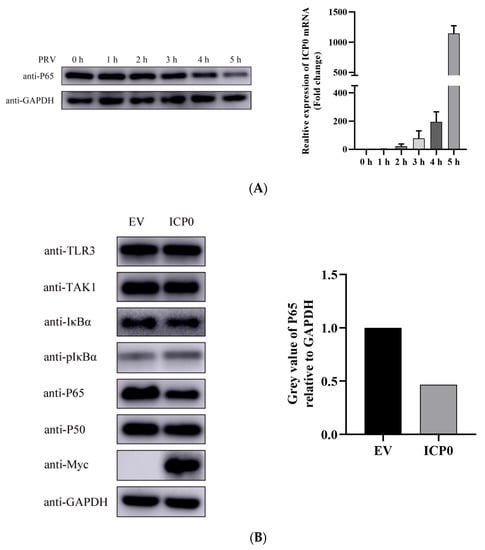 p65 may be a target of pseudorabies virus ICP0 protein. (A) PK15 cells were mock infected or infected with 1 MOI PRV for 1 h, 2 h, 3 h, 4 h and 5 h. Then, cells were collected at the indicated time points. Western blot was performed for p65 expression detection (Left). The expression of ICP0 mRNA was detected by RT-qPCR (Right). GAPDH served as loading control. (B) PK15 cells were transfected with pCMV-Myc empty vector (EV) (1.0 µg) or Myc-ICP0 (1.0 µg) plasmids for 24 h. Then, cells were harvested and lysed for Western blot detection. Factors included in the NF-κB signaling pathway such as TAK1, IκBα, pIκBα, p50 and p65 were detected. GAPDH served as loading control. The grey value of p65 relative to GAPDH was quantified. (C) PK15 cells were transfected with increasing concentrations of expression vectors for ICP0. After 24 h, cells were collected and lysed for p65 detection. GAPDH served as loading control. The grey value of p65 protein expression relative to GAPDH was also quantified. (D) PK15 cells were transfected with pCMV-Myc empty vector (EV) (1.0 µg) or Myc-ICP0 (1.0 µg) plasmids for 24 h. Then, cells were treated with or without 50 ng/mL recombinant human TNF-α and incubated for an additional 12 h. Western blot was performed for TAK1, IκBα, pIκBα, p50 and p65 detection with the indicated antibodies. GAPDH served as loading control.