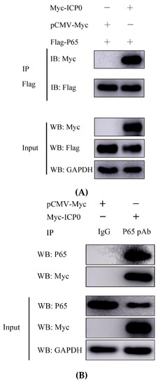 A plasmid encoding Flag-tagged p65 was constructed by molecular cloning methods. A Myc-tagged ICP0 plasmid was constructed in-house. All plasmids were verified by sequencing. The primer sequences used in this study are available upon request.