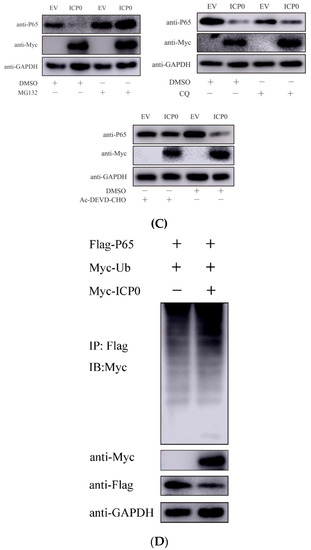 Next, to identify the pathway by which ICP0 achieves the degradation of p65, we transfected the Myc-ICP0 plasmid into PK15 cells and treated the cells with MG132 (ubiquitin–proteasome inhibitor), chloroquine (CQ, lysosome pathway inhibitor) or Ac-DEVD-CHO (caspase-3 inhibitor). Western blot results showed that MG132 prevented the degradation of p65 by ICP0 but not by CQ and caspase-3 inhibitor Ac-DEVD-CHO (Figure 4C). It is suggested that the degradation of p65 by ICP0 is achieved through the ubiquitin–proteasome pathway. Proteins degraded via the proteasome pathway must be ubiquitinated first. The above data indicated that ICP0 interacted well with p65; we next examined whether ICP0 affects p65 ubiquitination. The ubiquitination assay showed that ICP0 could increase p65 polyubiquitination (Figure 4D).