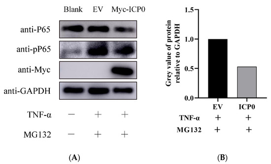 The classical hallmark of NF-κB activation is the degradation of IκBα, releasing two subunits, namely p50 and p65, which then undergo phosphorylation and ubiquitination modifications in the nucleus. ICP0 affects the NF-κB signaling pathway by targeting p65; therefore, it was necessary to verify the effect of ICP0 on p65 phosphorylation. Empty vector (EV) and Myc-ICP0 plasmids were transfected into PK15 cells respectively. Then, cells were treated with MG132 and TNF-α. The results showed that TNF-α induced significant phosphorylation of p65. Meanwhile, in the ICP0 transfection group, the phosphorylation level of p65 was effectively inhibited (Figure 5). These results indicated that ICP0 abrogated p65 phosphorylation.